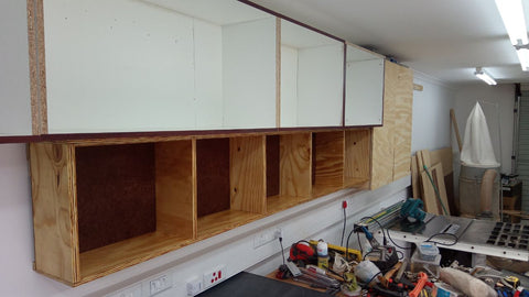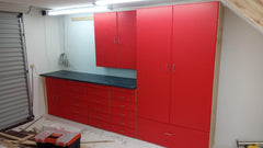 Anton: I have not started making "furniture" yet as such, but have rather used woodworking as I have needed it. When we renovated our house, I removed the old kitchen cupboards, cut them to size and re-used them in the workshop. I had the need for many drawers, I quite like the "Snapon Red" drawers as used in many automotive workshops,but I just do not like the associated price tags! I then set out to make an 18 drawer unit with adjoining cupboards out of cheap shutter ply and simply painted it red.