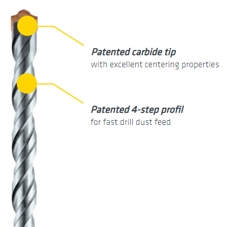 View full details3Pc SDS-plus F4 Forte Drill Bit Set Sizes: Ø 5.0, 6.0 & 8.0mm X 160/100mm Range of application The SDS-plus hammer drill bit F4 with its pa...