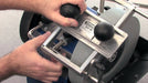 The base is mounted on an extra Universal Support and on the existing Universal Support of the machine. The base is locked with a screw. The knife is placed on the pair of hollow pins on the knife holder, while a magnet keeps the knife in place. The knife holder glides on the base, which has PTFE surfaces to minimise the friction. The knives are ground on the face, and adjusting the nut on the horizontal Universal Support sets the grinding depth.