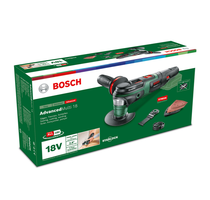 AdvancedMulti 18 enables speeds to be matched to the needs of each job and material. For optimal visibility, a 180° light band provides consistent illumination. Quick and easy, 3-second accessory changes are possible thanks to Bosch AutoClic. A large range of optional Starlock accessories covers a multitude of applications. Cut, saw, sand, scrape, route, and polish on wood, metal, plastic, plasterboard, grout, and mortar. The tool belongs to the POWER FOR ALL ALLIANCE. One battery can operate a large variety of tools from different brands.