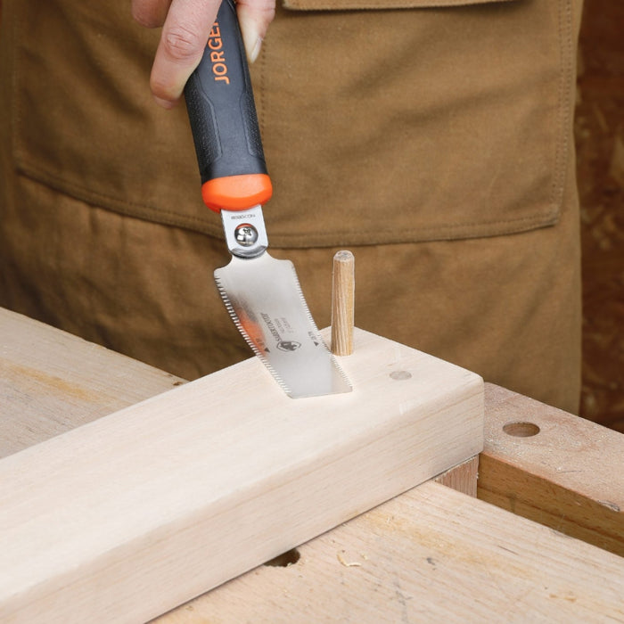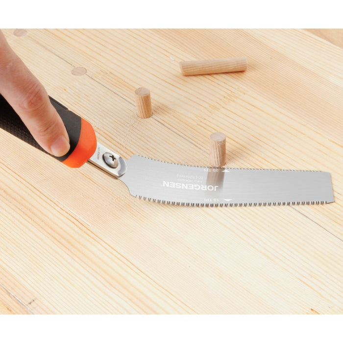 Jorgensen Professional Pull Saws are a cut above the competition. Made of premium, heat treated SK5 Japanese steel, cutting has never been faster or smoother. The Jorgensen Pro Double Edge Flush Cut Saw is ideal for cutting dowels, pegs, tenons or anything right up against another surface.