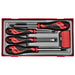 ID, tip type, and size. A hanging hole in the handle supports tethering or T-handle applications. Each screwdriver in the set is crafted from TT-MV PLUS steel alloy, a high-strength material with resistance to wear and deformation, even under demanding conditions. The round shafts have protruding ‘wings’ that secure the handle to the shaft. The set is arranged in a tool tray module size 1 (TT1), designed to integrate with the TengTools Tool Control System