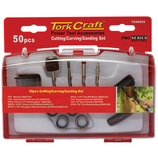Mini Cutting, Carving & Sanding Set The set includes a total of 50 cutting and carving mini tools that can be used with any Tork Craft rotary...