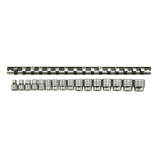 View full details16 piece 3/8" drive regular metric 6 point sockets supplied on a clip rail Chrome vanadium steel Satin finish Accessories 1 clip rail (370mm...