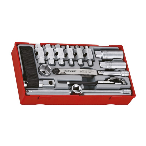 View full detailsSet consisting of 6 double ended drain plug sockets, 16 and 21mm 6 point spark plug sockets, oil filter wrench, 3" and 10" wobble extension bars,...
