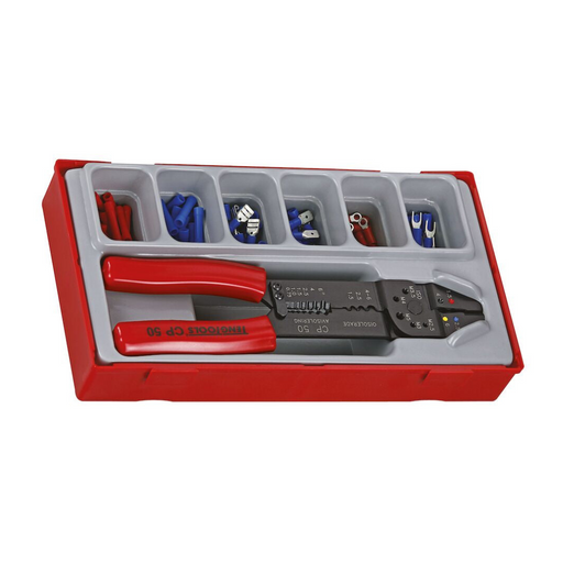 Tray consisting of crimping tool CP50 with slots for crimping red, blue and yellow terminals and cutters for bolts and wire Also included in the ...