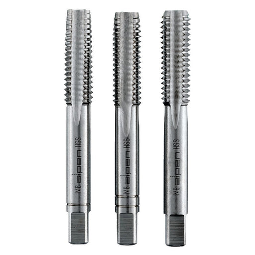 HSS Tap Set Size: M8 Pitch: 1,25mm Complete thread cutting tap set with pilot, middle and finishing cutter Range of application For throug...