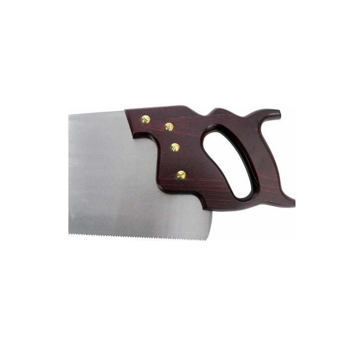 The saw plate is taper-ground and gets progressively thinner (approx. 0.005 inches) from the teeth to the back of the saw. This greatly reduced binding in the cuts. It comes with a handle made from stained European Beech and has brass button screws. The handle is attractive and comfortable in use. The 26" blade has 10tpi and is filed for cross cutting. Saw is hand-sharpened before leaving the factory. This saw can be resharpened.