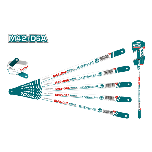Material: M42+D6A Number of teeth: 24T 5pcs/set Size: 300mm (12”) Suitable for: Hacksaw frame TOTAL-HACK1 and TOTAL-HACK2