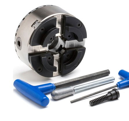 Lathe chucks hold work securely on the lathe. Four‑jaw scroll chucks allow you to mount bowl blanks, while various jaw sets grip spindles and irregular shapes. Accessories include faceplates, drive centres and tailstock live centres.