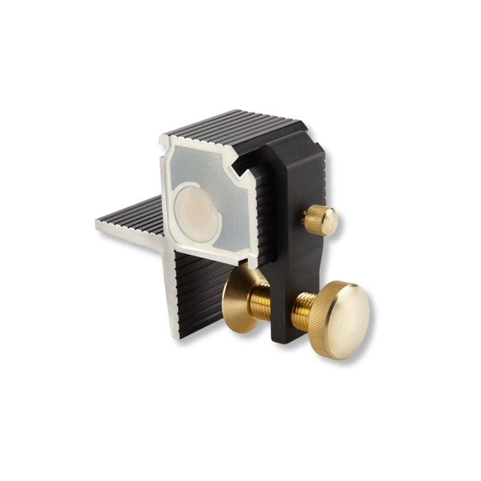 Manufactured using the same precision-machined aluminium extrusion as our dovetail saw guides, each reference surface has an embedded 3/4" rare-earth magnet and is covered with a low-friction UHMW pad. The magnets keep the saw aligned as you cut; the pads allow the saw to slide easily against the reference surface. The clamp can accommodate material from 1/4" to 1" thick.